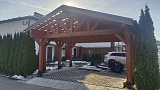 Навес для автомобилей Аларес — это функциональное и сбалансированное решение для защиты двух транспортных средств на компактной территории. Габариты 6,6×5,1 м и площадь 34 м² позволяют разместить автомобили с удобными проходами и достаточным пространством для открывания дверей, не занимая лишнюю землю на участке. Коньковая крыша с двумя скатами обеспечивает эффективный водоотвод и предотвращает скопление снега, что особенно важно в условиях частых осадков. Каркас выполнен из высококачественной хвойной древесины, прошедшей камерную сушку, что исключает деформации и гарантирует долговечность строения. Отсутствие хозблока делает всю полезную площадь доступной для парковки, а грамотная конструкция позволяет органично вписать навес в любой ландшафт. Кровельное покрытие из битумной черепицы "Shinglas" обеспечивает надежную защиту от осадков и придает навесу законченный вид.